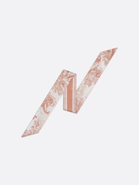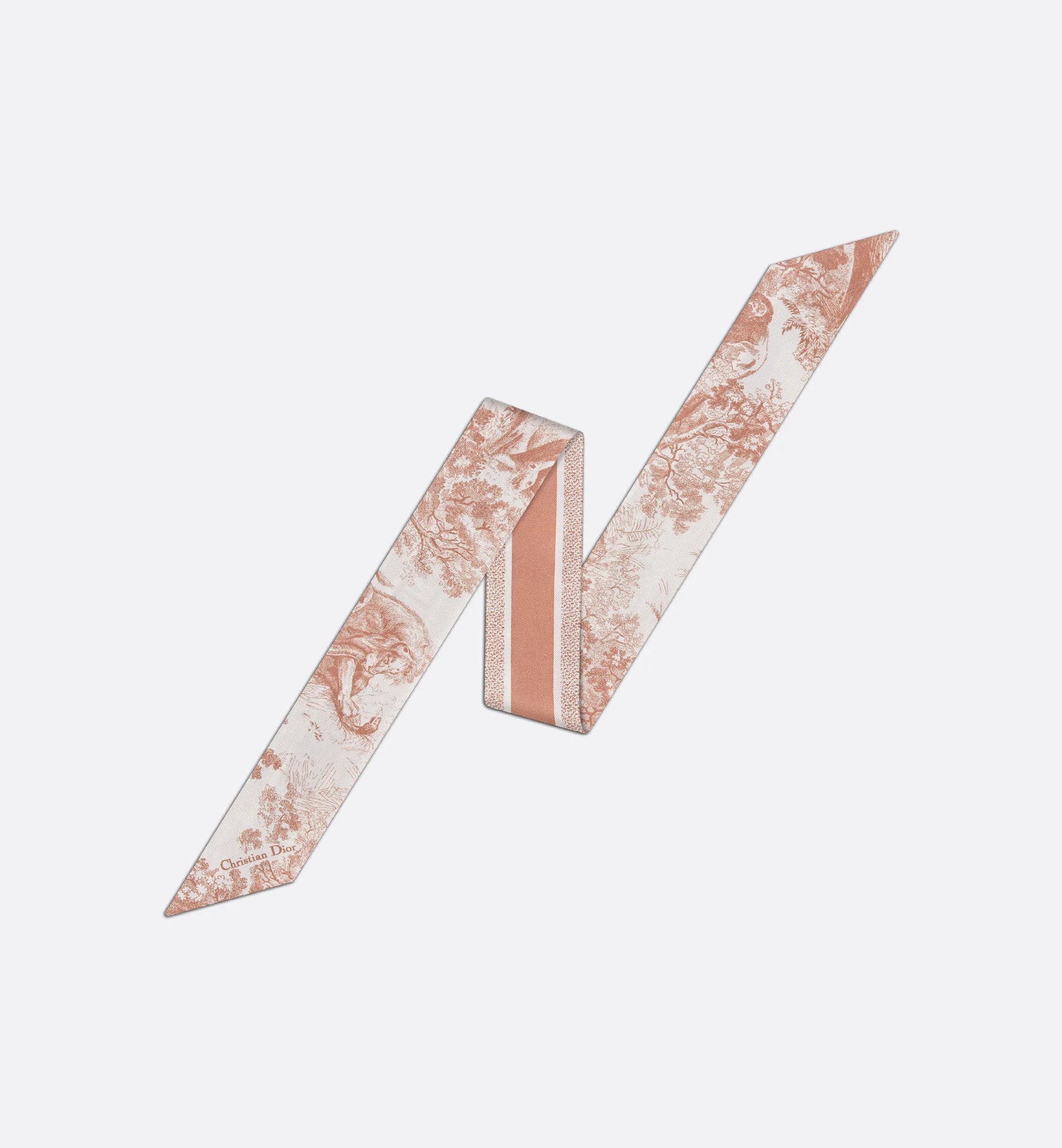 The Toile de Jouy Sauvage Mitzah scarf highlights the hallmark House motif. A timeless design, it is crafted in ivory and pink silk twill and is distinguished by an elongated shape with pointed ends. It is further embellished with a contrasting 'CHRISTIAN DIOR' signature jacquard band on the back. The Mitzah scarf will lend the finishing touch to any modern look and may be worn around the neck, tied at the wrist or on a bag. - Ivory and pink Toile de Jouy motif - Contrasting jacquard band with 'CHRISTIAN DIOR' signatures on the back - Pointed ends - 100% silk twill - Made in Italy Size & Fit - Dimensions: 6 x 105 cm / 2.5 x 41.5 inches