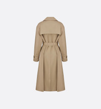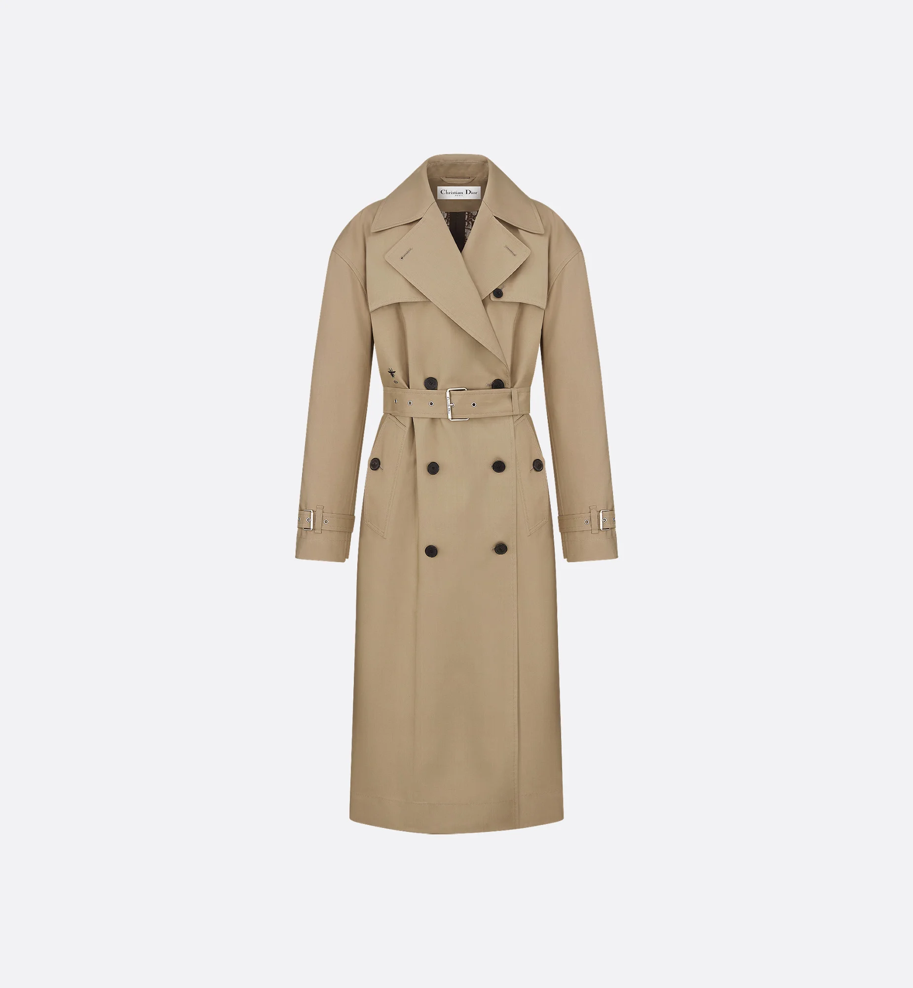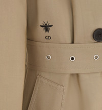 The trench coat revisits a wardrobe essential with the House's couture aesthetic. Crafted in beige cotton gabardine, it is embellished with a Dior Oblique motif on the interior. A belt with a metal buckle subtly highlights the waist for contemporary appeal. The trench coat will pair effortlessly with a skirt or pumps for a sophisticated look, or it can be worn open with jeans for a more casual and modern ensemble. - Embroidered hallmark bee and CD signature - Tonal belt with metal buckle - Double-breasted - Adjustable buckle cuffs - Dior Oblique jacquard bonded on the interior - Unlined - 100% cotton - Made in Italy Size & Fit - Standard fit - Length: 120 cm / 47 inches (size 38) - Long sleeves - Using our personalized tool will provide you with the best size recommendation - For more information, please review the size guide