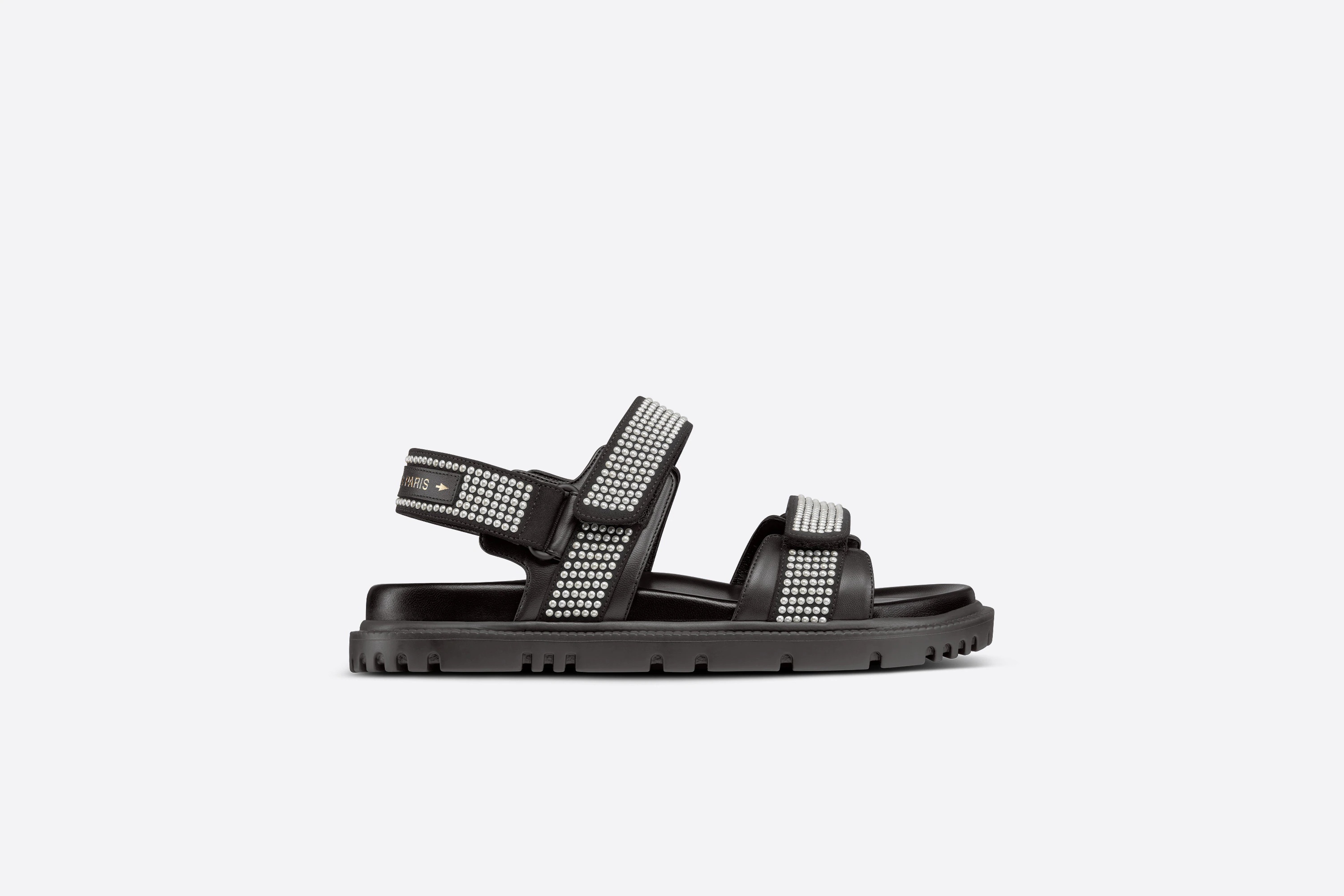 The DiorAct sandal boasts a modern silhouette in black technical fabric embellished with white resin pearls. The style features an anatomical-shaped sole made with ultra lightweight and comfortable leather. Adjustable scratch straps combine with a back leather strap inscribed with the 'CHRISTIAN DIOR PARIS' signature. The sandal will lend a contemporary touch to any look. - Gold-tone 'CHRISTIAN DIOR PARIS' signature at the back - Two adjustable scratch straps - Anatomically-shaped leather insole - Rubber sole with star, Christian Dior's lucky symbol - Made in Italy Size & Fit - The style fits true to size: we recommend ordering your normal shoe size - For those with wider feet, we recommend ordering a half-size larger than your normal size - For more information, please review the size guide