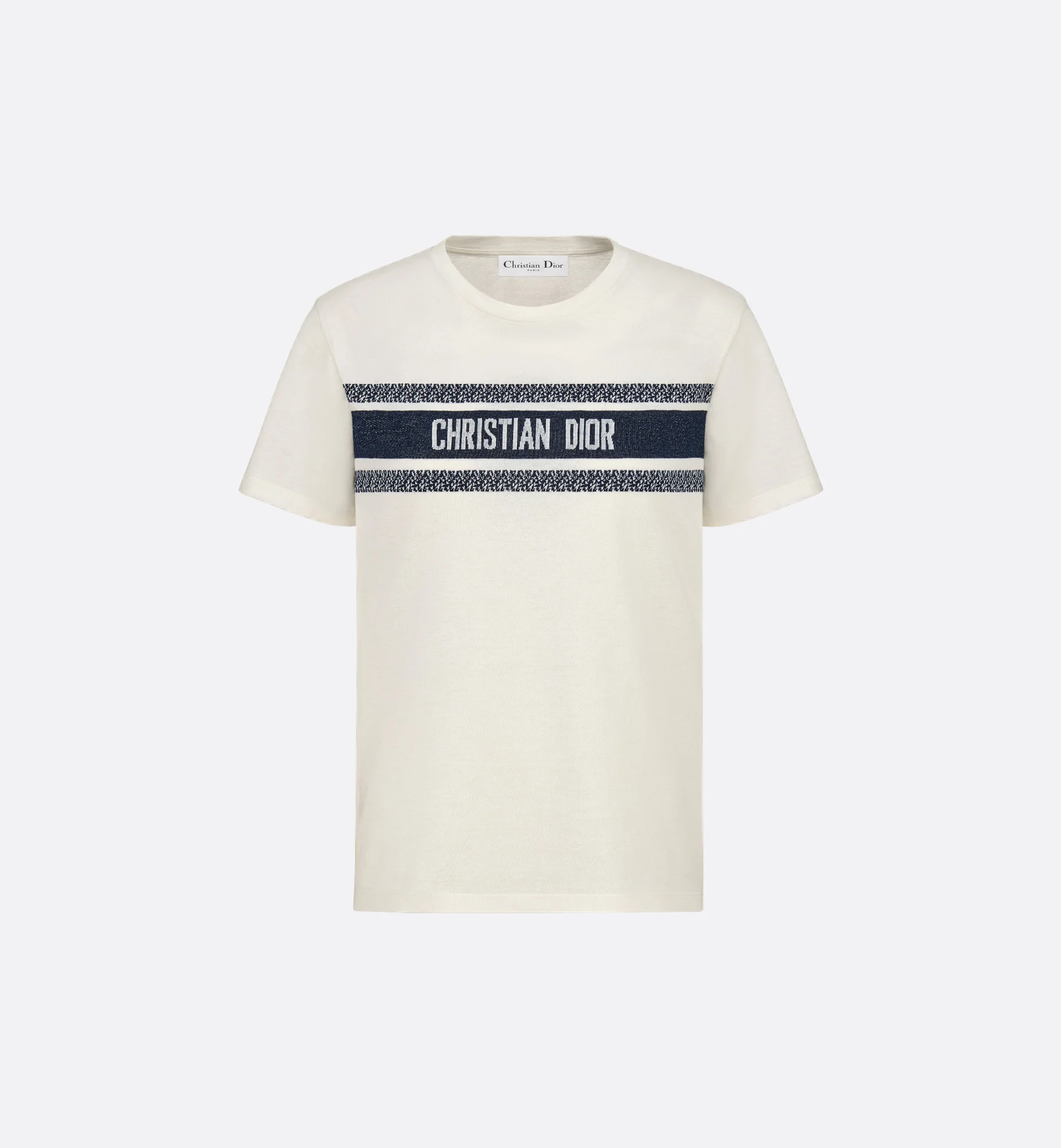 The T-shirt is an elegant creation with sportswear appeal. Crafted in white cotton jersey, the design is embellished with a navy blue contrasting band with the Christian Dior signature on the front. The garment may be coordinated with other Dioriviera creations. - Contrasting band with Christian Dior signature - 100% cotton - Made in Italy Size & Fit - Regular fit - Size XS: shoulder-to-shoulder width: 39 cm / 15.5 inches, chest size: 90 cm / 35.5 inches, outside and inside sleeve lengths: 16.5 and 6 cm / 6.5 and 2.5 inches, garment length: 61 cm / 24 inches - Size S: shoulder-to-shoulder width: 40 cm / 15.5 inches, chest size: 94 cm / 37 inches, outside and inside sleeve lengths: 17 and 7 cm / 6.5 and 3 inches, garment length: 62 cm / 24.5 inches - Size M: shoulder-to-shoulder width: 40 cm / 15.5 inches, chest size: 98 cm / 38.5 inches, outside and inside sleeve lengths: 17.5 and 7 cm / 7 and 3 inches, garment length: 63 cm / 25 inches - Size L: shoulder-to-shoulder width: 41 cm / 16 inches, chest size: 102 cm / 40 inches, outside and inside sleeve lengths: 19 and 8 cm / 7.5 and 3 inches, garment length: 64 cm / 25 inches - Size XL: shoulder-to-shoulder width: 42 cm / 16.5 inches, chest size: 106 cm / 41.5 inches, outside and inside sleeve lengths: 19.5 and 7 cm / 7.5 and 3 inches, garment length: 66 cm / 26 inches - Each measurement may have a normal variation of 2 cm / 0.75 inch - Using our personalized tool will provide you with the best size recommendation - For more information, please review the size guide