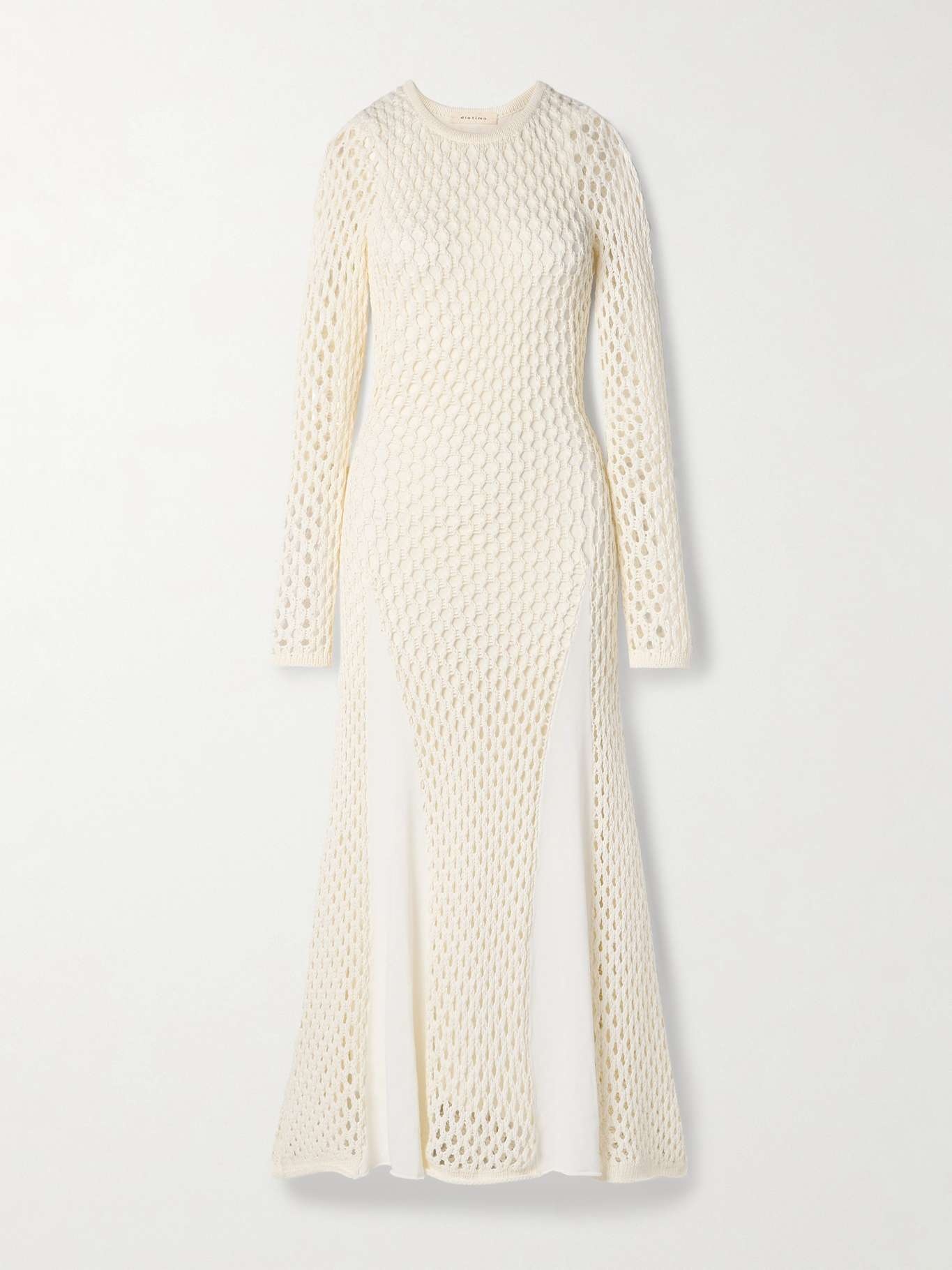 EDITORS'NOTES Inspired by her Jamaican upbringing, Diotima founder Rachel Scott seeks to present "a nuanced vision of Caribbean style" through her collections. This 'Anansi' dress is crocheted for a mesh-like effect and paneled with solid stretch-knit along the maxi skirt. SIZE & FIT - 1 = UK 6/ US 0-2/ FR 34-36/ IT 38 - 2 = UK 8/ US 4-6/ FR 38-40/ IT 40 - 3 = UK 10/US 8/ FR 42/ IT 42 - 4 = UK 12-14/ US 10-12/ FR 44/ IT 44 - Fits true to size, take your normal size - Intended for a slim fit - Designed with a slim-fitting slip - Mid-weight, open knit - Model is 177cm/ 5'10" and is wearing the designer's size 1 - Bust: 79cm/ 31” - Waist: 60cm/ 23.5” - Hip: 90cm/ 35.5" DETAILS & CARE - Ivory crochet and stretch-knit - Slips on - 48% cotton, 37% polyester, 12% viscose, 3% nylon; lining: 72% viscose, 28% polyester - Dry clean