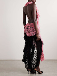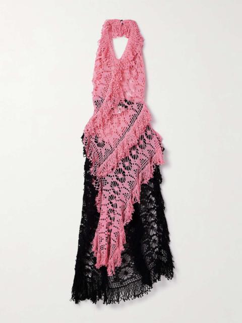 EDITORS'NOTES Rachel Scott draws on her Jamaican heritage while designing for Diotima - the crocheted pieces, like this cotton 'Drift' midi dress, are handmade by local craftspeople and inspired by traditional doilies. It has a two-tone asymmetric construction and fringed halterneck. Underpin yours with a slip or bodysuit for coverage. Responsible Craftsmanship. This product promotes artisanal skills and a brand that invests in communities and adheres to fair-trade principles. Find out more about our NET SUSTAIN criteria here. SIZE & FIT - 1 = UK 6/ US 0-2/ FR 34-36/ IT 38 - 2 = UK 8/ US 4-6/ FR 38-40/ IT 40 - 3 = UK 10/US 8/ FR 42/ IT 42 - 4 = UK 12-14/ US 10-12/ FR 44/ IT 44 - Fits true to size, however those who are between sizes should take the smaller size - Designed to be fitted at the bust and waist, slightly loose at the hip - Mid-weight, open knit - Model is 177cm/ 5'10" and is wearing the designer's size 1 - Bust: 80cm/ 32" - Waist: 61cm/ 24" - Hip: 86cm/ 34" DETAILS & CARE - Pink and black crocheted cotton - Slips on - 100% cotton - Green dry clean - Designer color: Ginger Pink