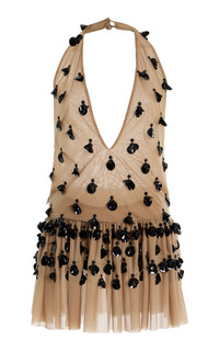PRODUCT DETAILS - Halter neck, backless, peplum flare, beaded embellishments - Zip fastening along back - Unlined - Composition: 100% Polyester - Color: nude - Dry clean only - Fall/Winter '25