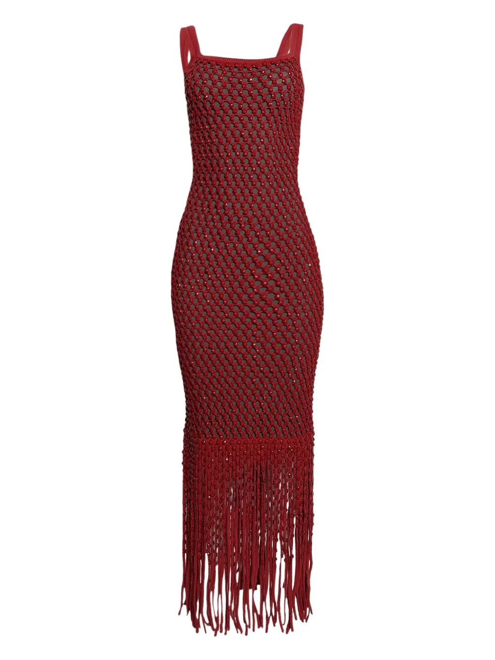 Gala fringe-detail knitted dress Highlights - Deep red - Knitted design - Fringe hem - Square neckline - Sleeveless - Fitted bodice Imported Composition Cotton 76%, Nylon 24% Washing instructions Read Manufacturer Guidelines