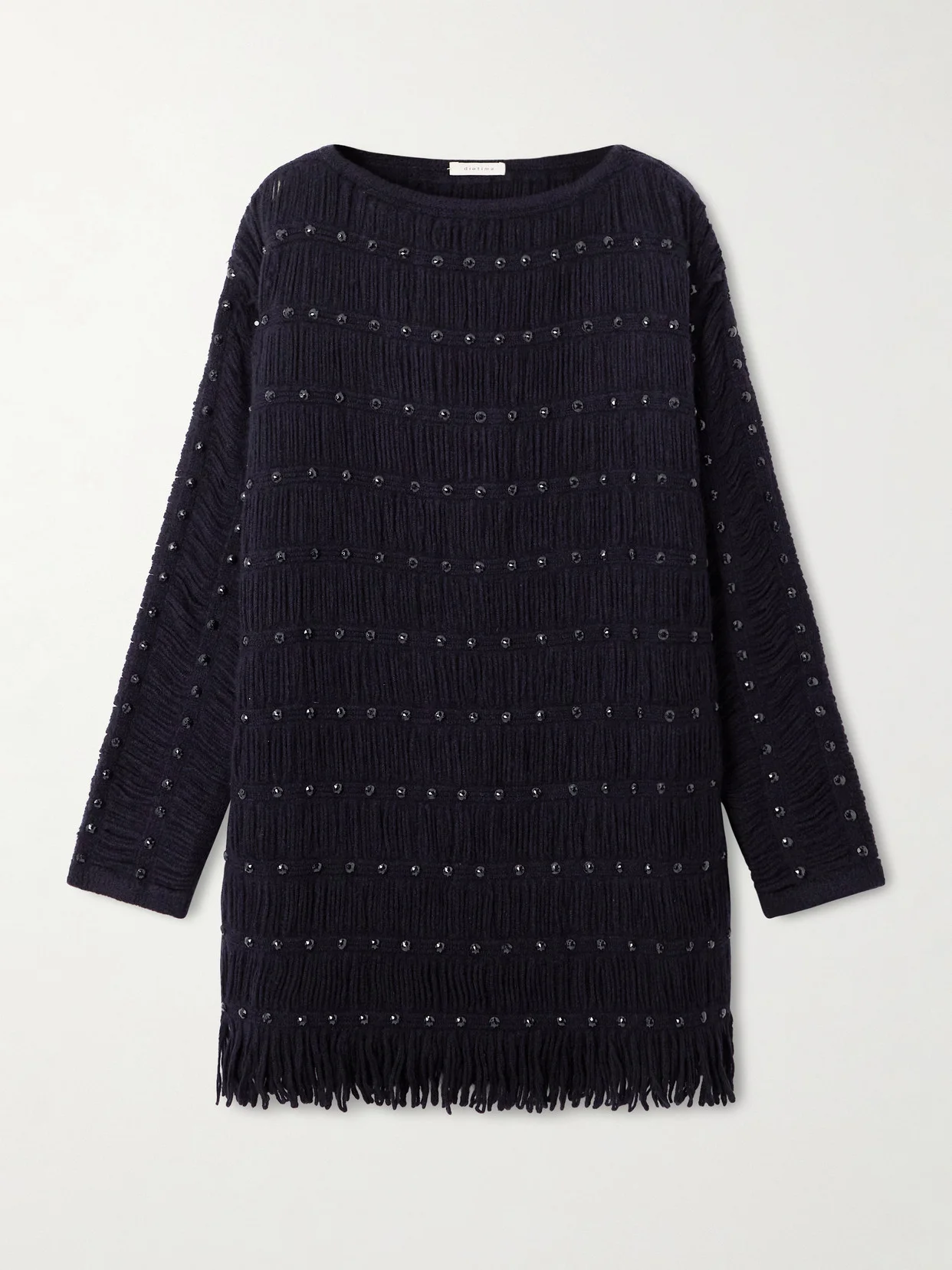 Notte Fringed Embellished Open-knit Merino Wool-blend Mini Dress