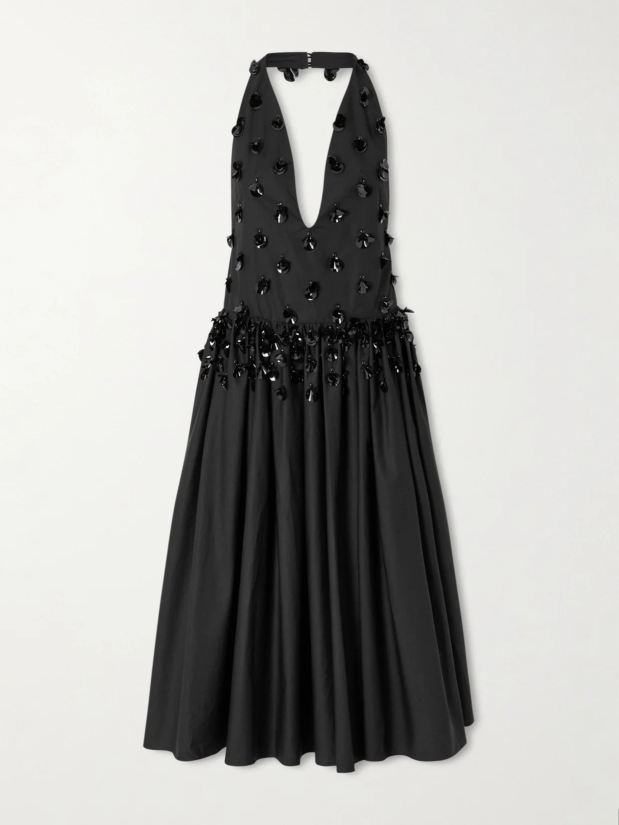 Diotima's gown is embellished with beads and oversized paillettes that glint beautifully in the light. Cut from cotton-poplin, it has a halterneck with a plunging neckline and full pleated skirt.