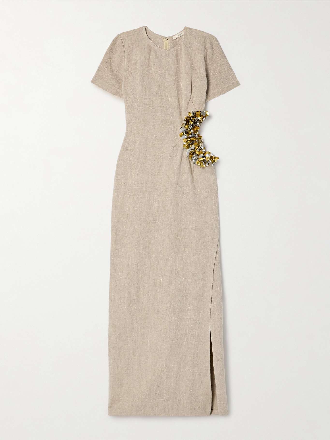 EDITORS'NOTES Like all of the brand's designs, Diotima's 'Seaford' dress is infused with the vibrant spirit of the Caribbean. Made from lightweight linen, it has a hip-baring cutout that's traced with light-catching, metallic paillettes. The silver and gold tones mean it will match any jewelry. SIZE & FIT - 1 = UK 6/ US 0-2/ FR 34-36/ IT 38 - 2 = UK 8/ US 4-6/ FR 38-40/ IT 40 - 3 = UK 10/US 8/ FR 42/ IT 42 - 4 = UK 12-14/ US 10-12/ FR 44/ IT 44 - Fits true to size, take your normal size - Intended for a slim fit - Wraparound design, ties at the waist for an flexible fit - Lightweight, non-stretchy fabric - Model is 177cm/ 5'10"and is wearing the designer's size 1 - Bust: 81cm/ 32" - Waist: 61cm/ 24” - Hip: 81cm/ 32" DETAILS & CARE - Taupe linen - Concealed hook and zip fastening at back - 100% linen; backing: 100% viscose - Dry clean