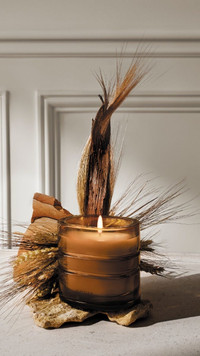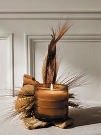Mesa Verde. On the high plateaux of Colorado, a city of stone dwellings perches beneath overhanging cliffs. Fields of cereal crops, ripened and yellowed in the sun, stretch out to the far horizon. Light the Terres Blondes (\"Golden Lands\") candle and you’re escaping into the great American west – roaming its fertile primordial lands, tasting the breezes of warm air. It’s a return to the roots – to the essence. This candle weighs 270g.