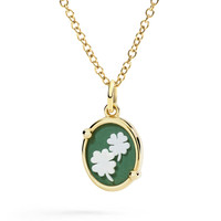 DMC5016-CAMEO-VE09G The DoDo Cameo is a small masterpiece of the goldsmithing art: in green and white porcelain, it has a hand-hammered 9K yellow gold frame. The back features an engraving of the words "Good luck", while the centre of the charm features an openwork four-leafed clover. Cameo charm in 9k yellow gold and white and green porcelain with engraving on back. Product Care Every Dodo jewel is made to be worn every day and on every occasion. This is why no extraordinary maintenance is needed, especially if it is delicately handled and cleaned. If you want to preserve the shine of Dodo jewelry, we recommend you to store it in a clean, dry place away from any heat sources.