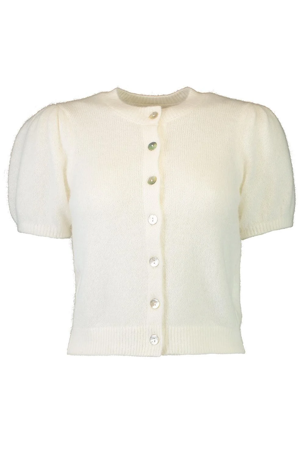 DETAILS AND INSIGHT Doen anisa cardigan in ivory. 35% Polyamide 33% Superfine Alpaca 32% Merino Wool Dry Clean Only Made In China Style 1725-4592-IVORY
