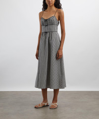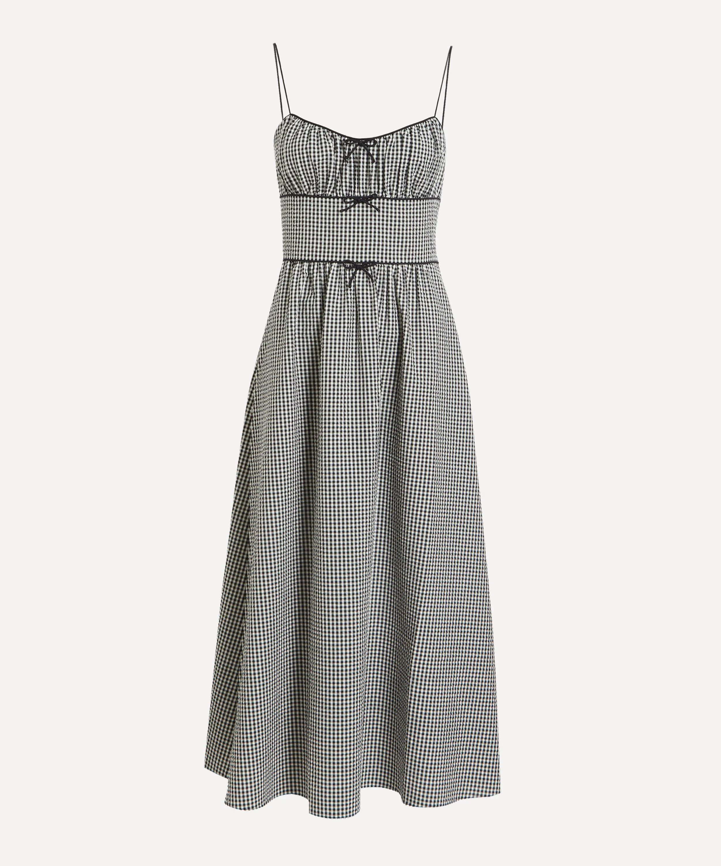 DETAILS Cotton seersucker dress Midi length Square neckline Skinny spaghetti straps Fitted bodice with three fixed bow Ankle-grazing A-line skirt Contrast piping SIZE & FIT Model is 178cm/5'10"; Chest: 79cm; Waist: 62cm; Hip: 88cm and wears S COMPOSITION & CARE 100% Cotton Hand wash cold. Do not bleach. Lay flat to dry. Low iron