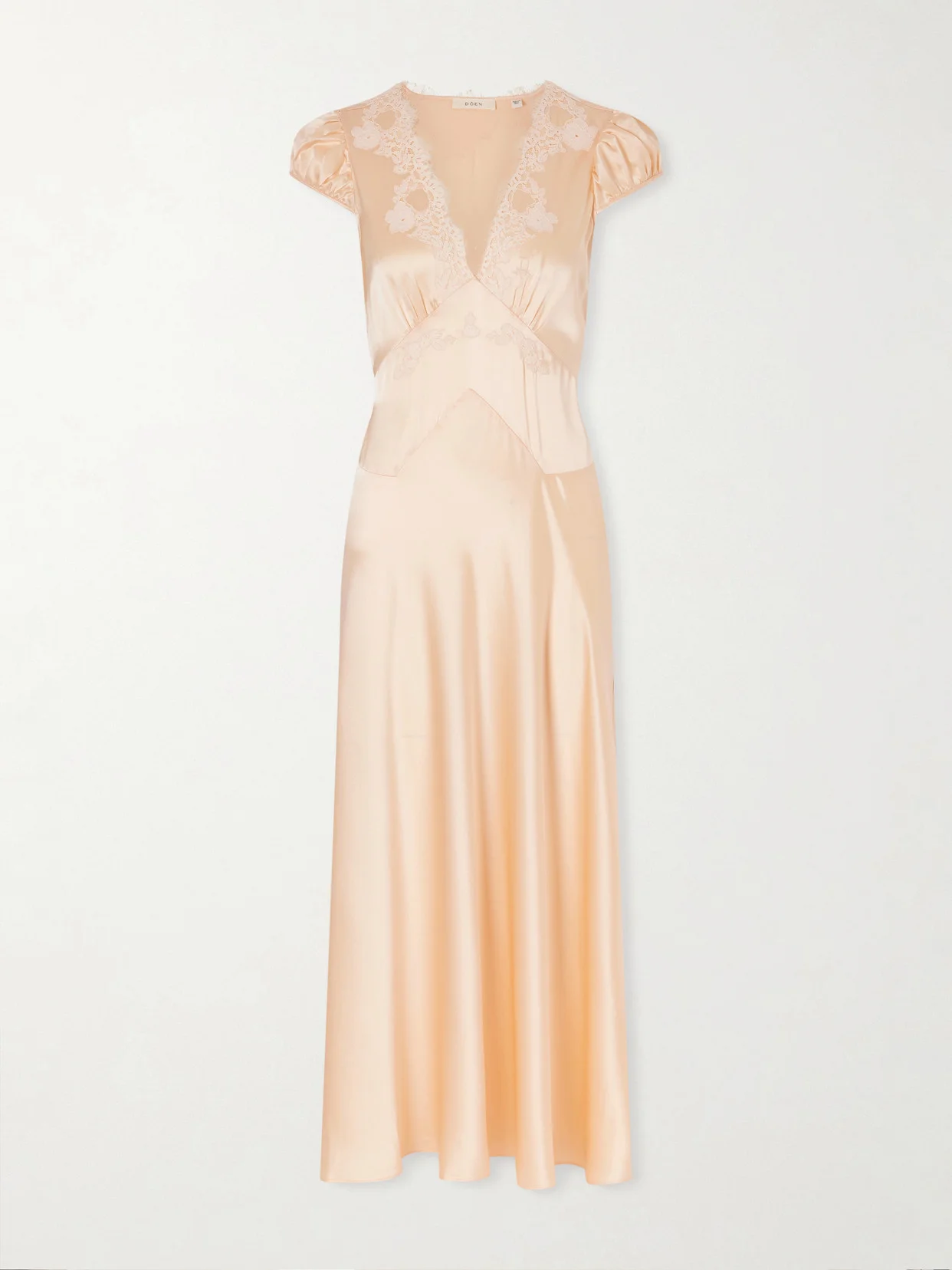 DOEN's 'Coraline' maxi dress takes cues from romantic lingerie. Designed with lace trims along the V-neckline, it's made from panels of lustrous silk-satin that are strategically cut and placed to draw the eye inward and has gently puffed sleeves. Adjust the slim ties to accentuate the waist.