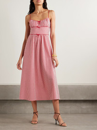 DOEN's 'Belline' dress is made from lightweight recycled-seersucker that's blended with plenty of cotton and patterned with classic gingham checks. The gently gathered bodice is finished with delicate bows, adding a charming finishing touch. Lower-Impact Materials. This product is made using at least 50% lower-impact materials or ingredients. Find out more about our NET SUSTAIN criteria here. Size & Fit - Fits true to size, take your normal size - Intended to be slightly fitted at the bust and waist, loose at the hip - Lightweight, non-stretchy fabric - Model is 175cm/ 5'9" and is wearing a US 2 Details & Care - Red and white recycled-seersucker - Concealed zip fastening along side - 65% recycled polyester, 35% cotton - Dry clean - Designer color: Rouge La Maddalena Gingham