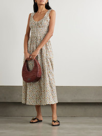 DOEN's clothing is characterized by its feminine details and pretty floral prints. Showcasing both, this 'Emmaretta' midi dress is made from cotton-voile patterned with cheery blooms and has a shirred bodice with slim, adjustable ties. The ruffled straps and floaty skirt create nice dimension. Lower-Impact Materials. This product is made using at least 50% lower-impact materials or ingredients. Find out more about our NET SUSTAIN criteria here. Size & Fit - Fits true to size, take your normal size - Designed to be fitted at the bust and waist, slightly loose at the hip - Mid-weight, non-stretchy fabric - Model is 175cm/ 5'9" and is wearing a size XSmall Model measurements: - Bust: 81cm/ 32" - Waist: 62cm/ 24.5" - Hip: 89cm/ 35" Details & Care - Multicolored cotton-voile - Slips on - 100% cotton - Hand wash or dry clean - Designer color: Jardin du Chateau