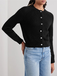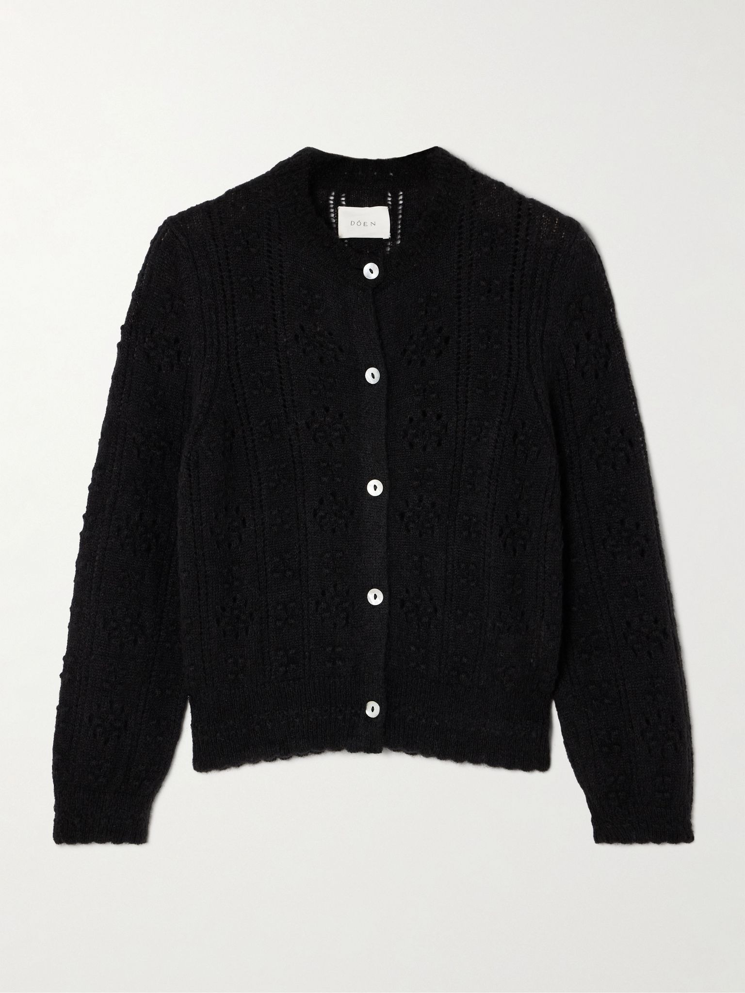 DOEN's 'Cassidy' cardigan is a timeless piece you'll still be reaching for in seasons to come. It's made using generous amounts of baby alpaca and wool for warmth and softness, and is pointelle-knitted for a delicate texture. Match your jewelry to the glossy mother-of-pearl button. Details & Care - Black alpaca-blend - Button fastenings through front - 50% alpaca, 28% polyamide, 22% wool - Hand wash - Mother-of-pearl: South Africa
