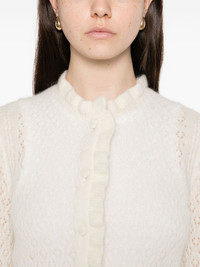 frills perforated cardigan Highlights - White - Frills - Perforated - Button fastening - Long sleeves - Round neck Imported Composition Alpaca 50%, Polyamide 28%, Wool 22% SIZE & FIT Model measurements Height 5 ft 11 in(1.8 m) Bust/Chest 32.28 in(82 cm) Hips 36.22 in(92 cm) Waist 25.19 in(64 cm) Washing instructions Dry Clean Only