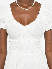Leanne midi dress Highlights - White - Organic cotton - Poplin texture - Frilled neckline - Short puff sleeves - Ruffle cuffs - Smocked waist - A-line skirt - Straight hem - Mid-length Imported Composition Organic Cotton 100% SIZE & FIT Model measurements Height 5 ft 10 in(1.78 m) Bust/Chest 31.49 in(80 cm) Hips 37 in(94 cm) Waist 23.62 in(60 cm) FittingInformation Designed to be unstructured, offering a loose fit throughout The elasticated waist allows for a comfortable fit Made from a lightweight non-stretch fabric Washing instructions Hand Wash