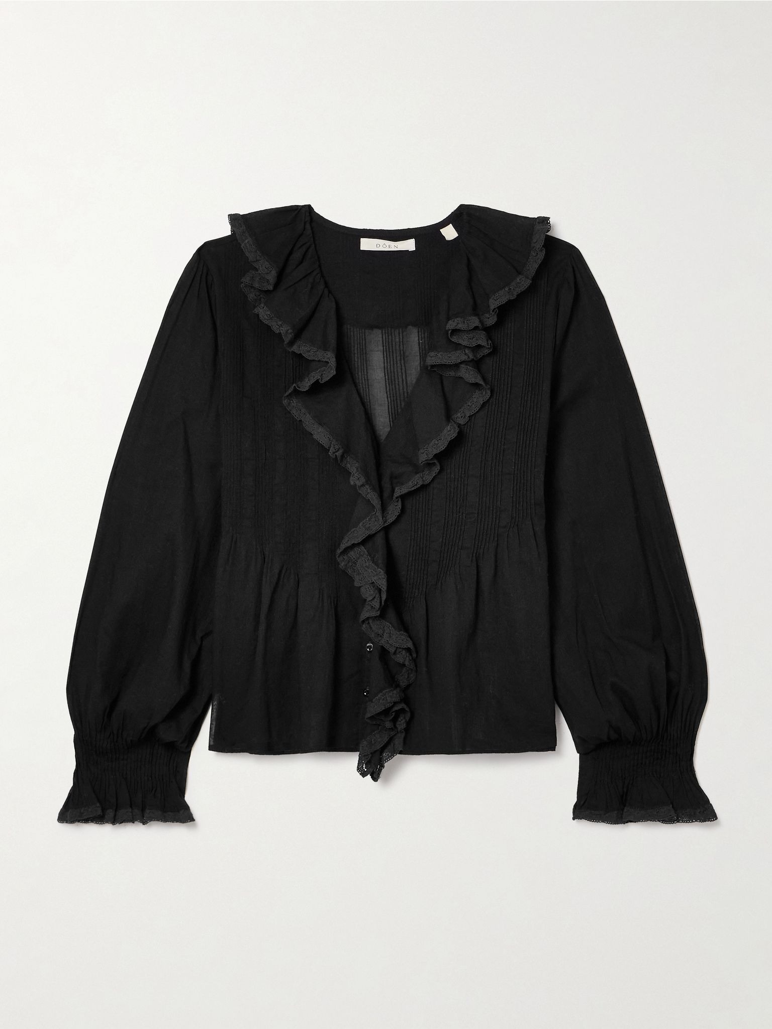 DOEN's 'Hardy' blouse has a cool Western feel enhanced by the pintucked bodice and lace-trimmed ruffles. It's made from organic cotton-voile and has fitted cuffs that create voluminous blouson sleeves. Style yours with relaxed jeans and a tote. Size & Fit - Fits true to size, take your normal size - Designed for a slightly loose fit - Lightweight, non-stretchy fabric - Model is 177cm/ 5'10" and is wearing a size Small Model measurements: - Bust: 80cm/ 31.5" - Waist: 60cm/ 23.5" - Hip: 89cm/ 35" Details & Care - Black organic cotton-voile and lace - Concealed button fastenings through front - 100% organic cotton - Hand wash