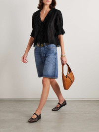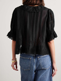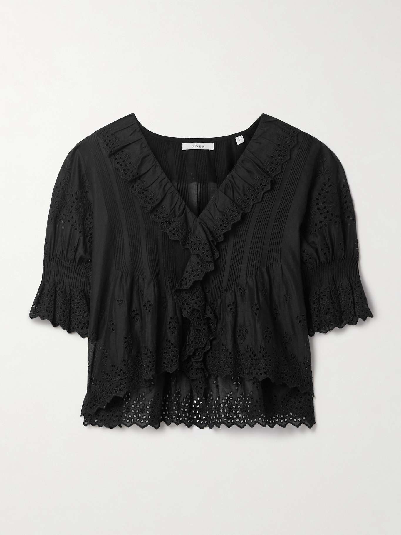 EDITORS'NOTES DOEN's 'Henri' top is designed with carefully thought-out details that come together to create such a lovely result. Made from broderie anglaise cotton, it's meticulously pintucked and has cascading ruffles tracing the neckline. The shirred, puffed sleeves add volume. SIZE & FIT - Fits true to size, take your normal size - Designed for a loose fit - Cropped length - Lightweight, non-stretchy fabric - Model is 180cm/ 5'11" and is wearing a size Small DETAILS & CARE - Black broderie anglaise cotton - Concealed button fastenings through front - 100% cotton - Hand wash