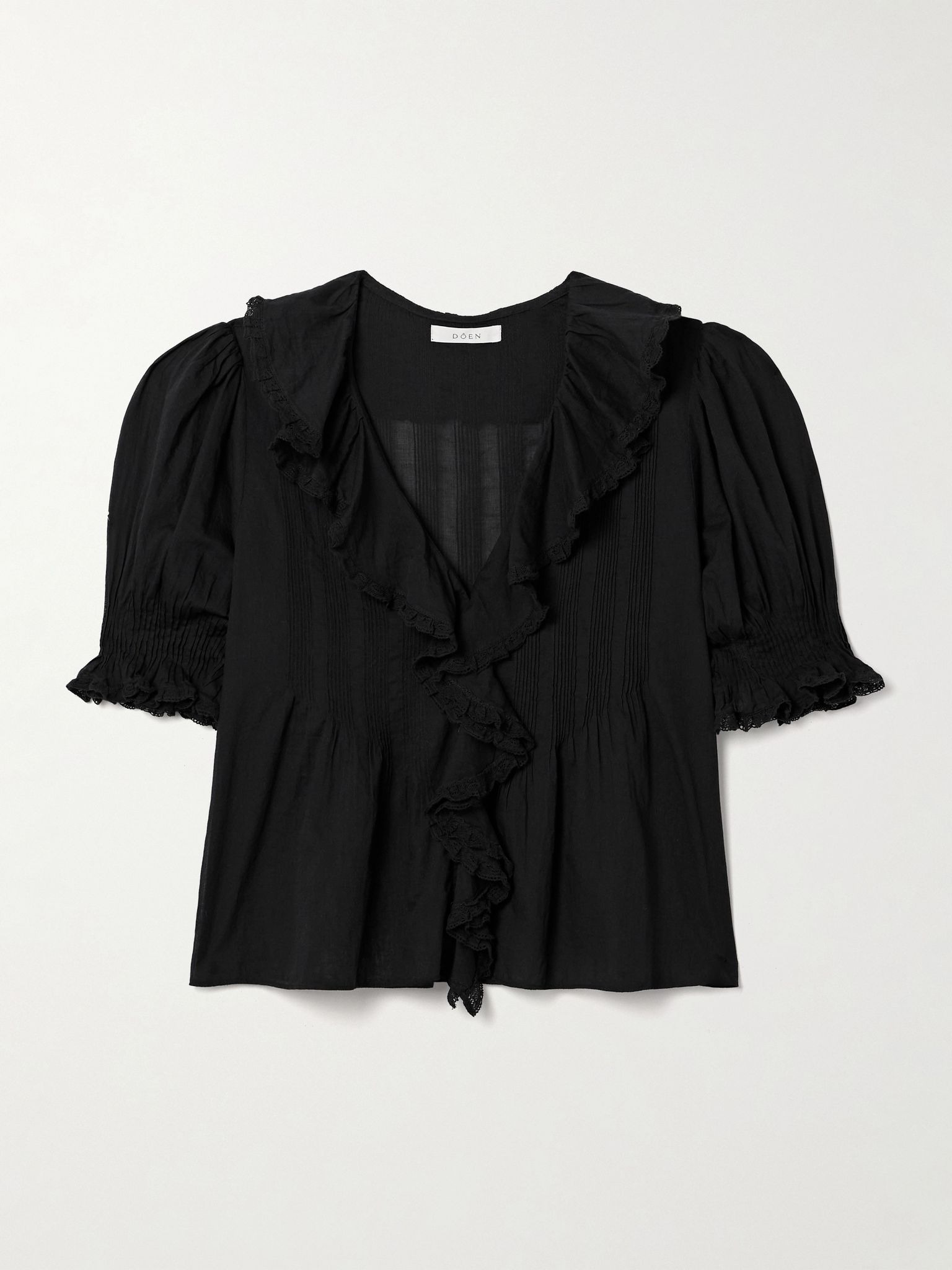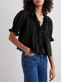 DOEN's 'Henri top is a lovely confection of ruffles and pintucks. Made from organic cotton-voile that's grown without the use of harmful pesticides and synthetic fertilizers, it has smocked puffed sleeves and flouncy ruffles tracing the neckline. It looks sweet styled with straight-leg jeans. Size & Fit - Fits true to size, however those who are between sizes should take the smaller size - Designed for a loose fit - Lightweight, non-stretchy fabric - Model is 180cm/ 5'11" and is wearing a size XSmall Details & Care - Black organic cotton-voile - Concealed button fastenings along front - 100% organic cotton - Machine wash