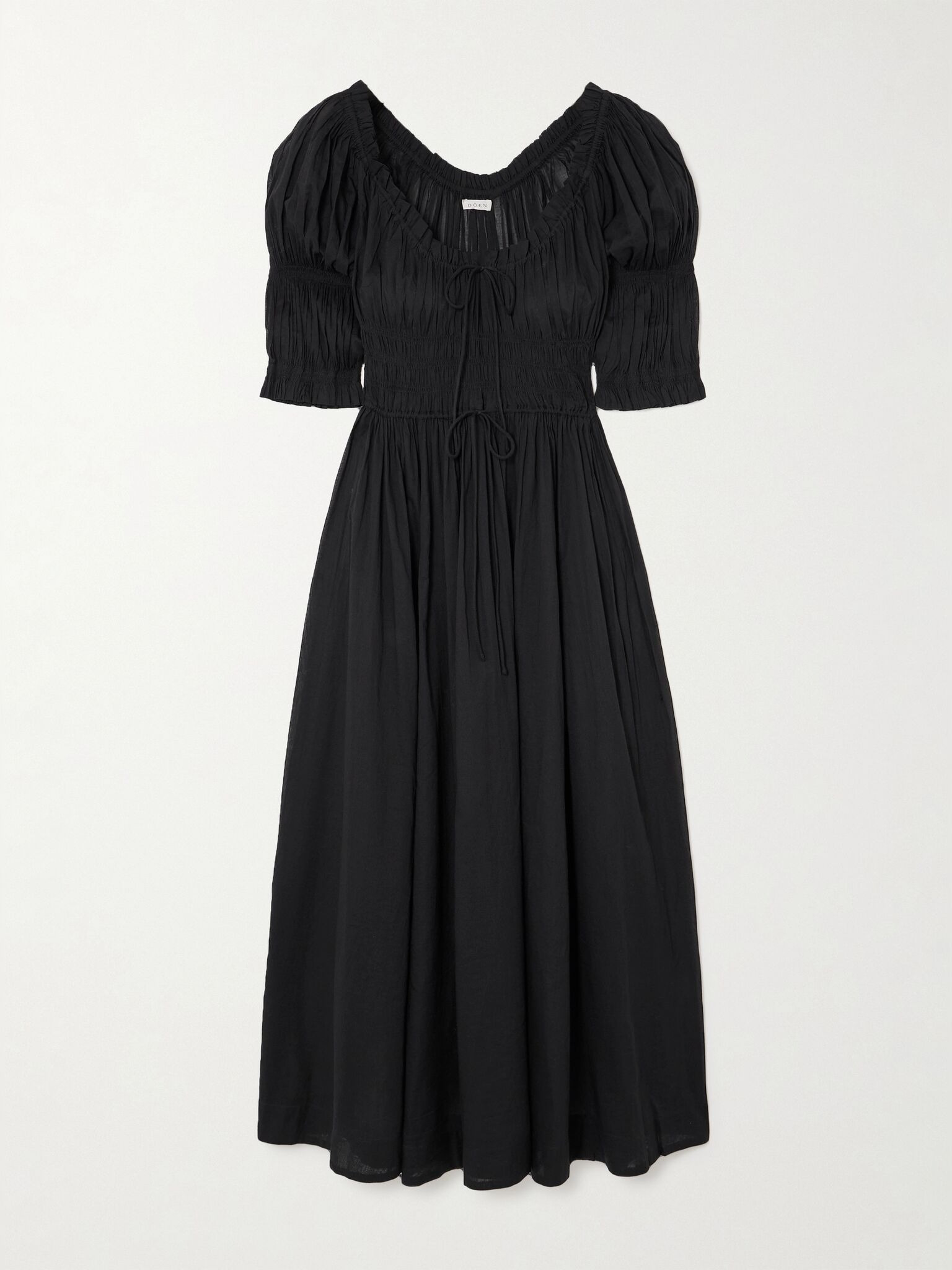 DOEN's 'Ischia' maxi dress is made from organic cotton-voile so it has a soft, lightweight handle. It's designed with romantic puffed sleeves and shirred panels that define your waist. Style yours with easy slides or heeled mules. Lower-Impact Materials. This product is made using at least 50% lower-impact materials or ingredients. Find out more about our NET SUSTAIN criteria here. Size & Fit - Fits true to size, take your normal size - Designed to be slightly fitted at the bust and waist, loose at the hip - Ties at the front for an adjustable fit - Mid-weight, non-stretchy fabric - S/M/L sizing Details & Care - Black organic cotton-voile - Slips on - 100% organic cotton - Hand wash