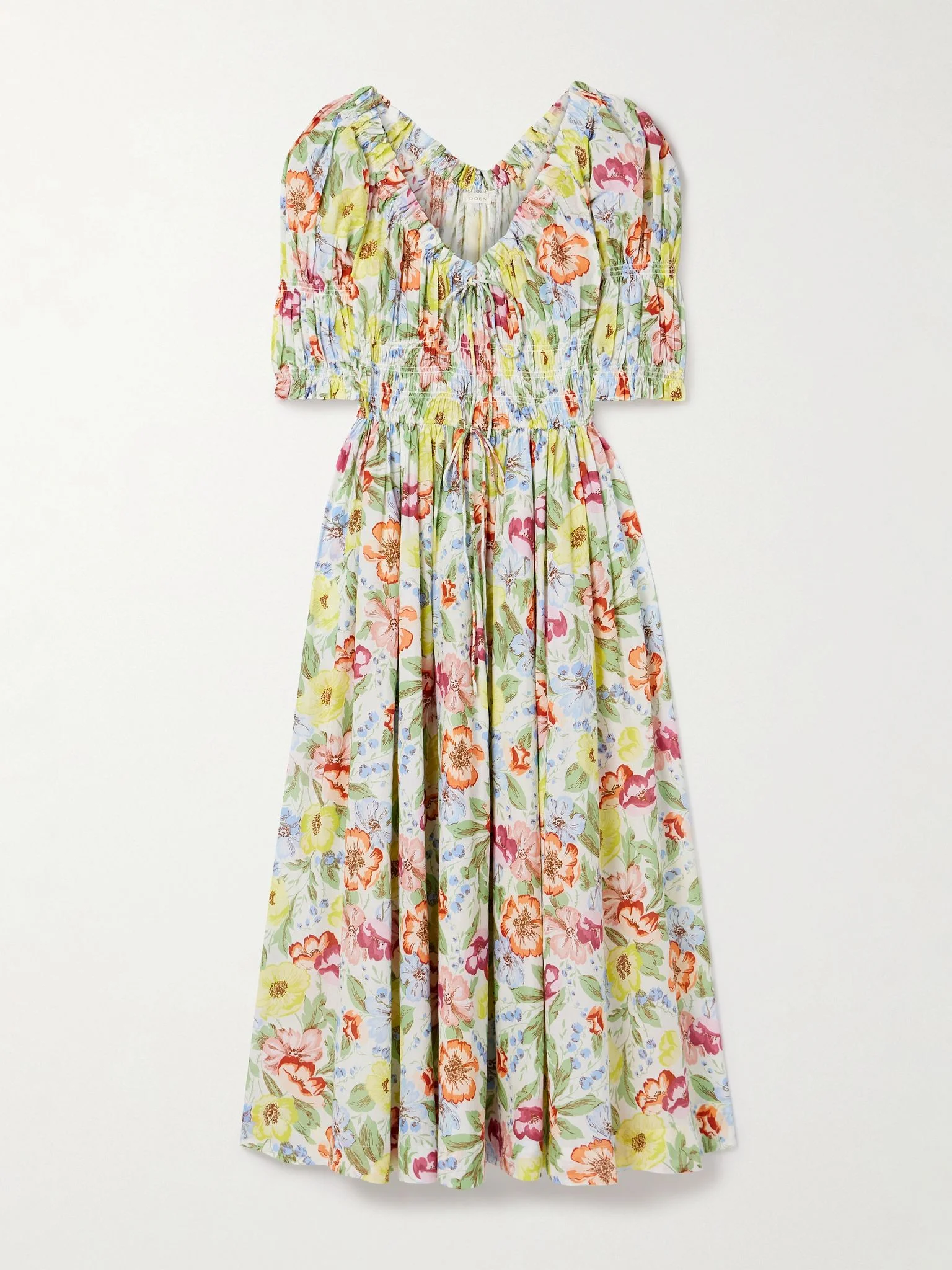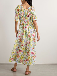 DOEN's 'Ischia' midi dress is made from floral-print cotton-voile that has a soft, lightweight handle. It's designed with romantic puffed sleeves and shirred panels that define your waist. Style yours with easy slides or heeled mules. Lower-Impact Materials. This product is made using at least 50% lower-impact materials or ingredients. Find out more about our NET SUSTAIN criteria here. Size & Fit - Fits true to size, take your normal size - Designed to be fitted at the bust and waist, loose at the hip - Drawstring waist, designed for a flexible fit - Lightweight, slightly stretchy fabric - Model is 180cm/ 5'11" and is wearing a size Small Details & Care - Multicolored cotton-voile - Slips on - 100% cotton - Hand wash
