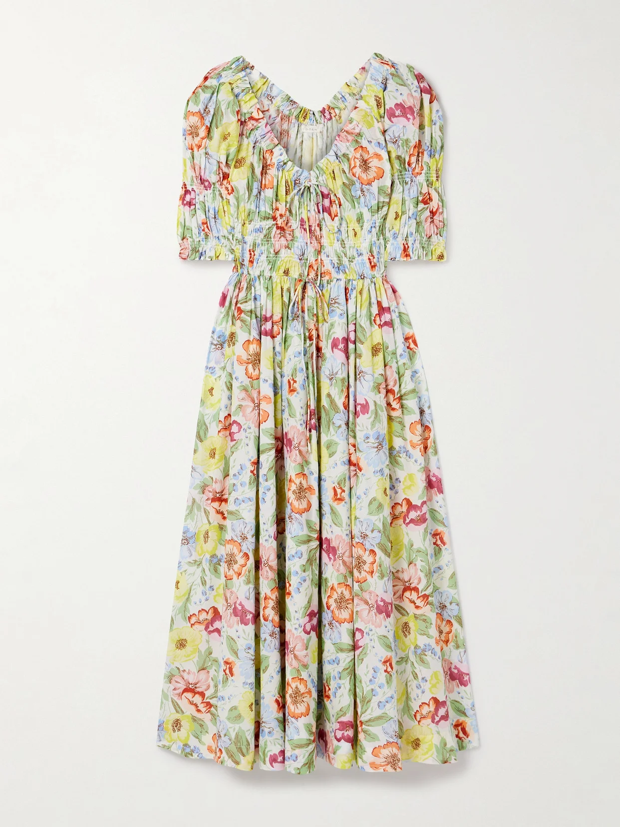 Ischia Shirred Floral-print Cotton-voile Midi Dress