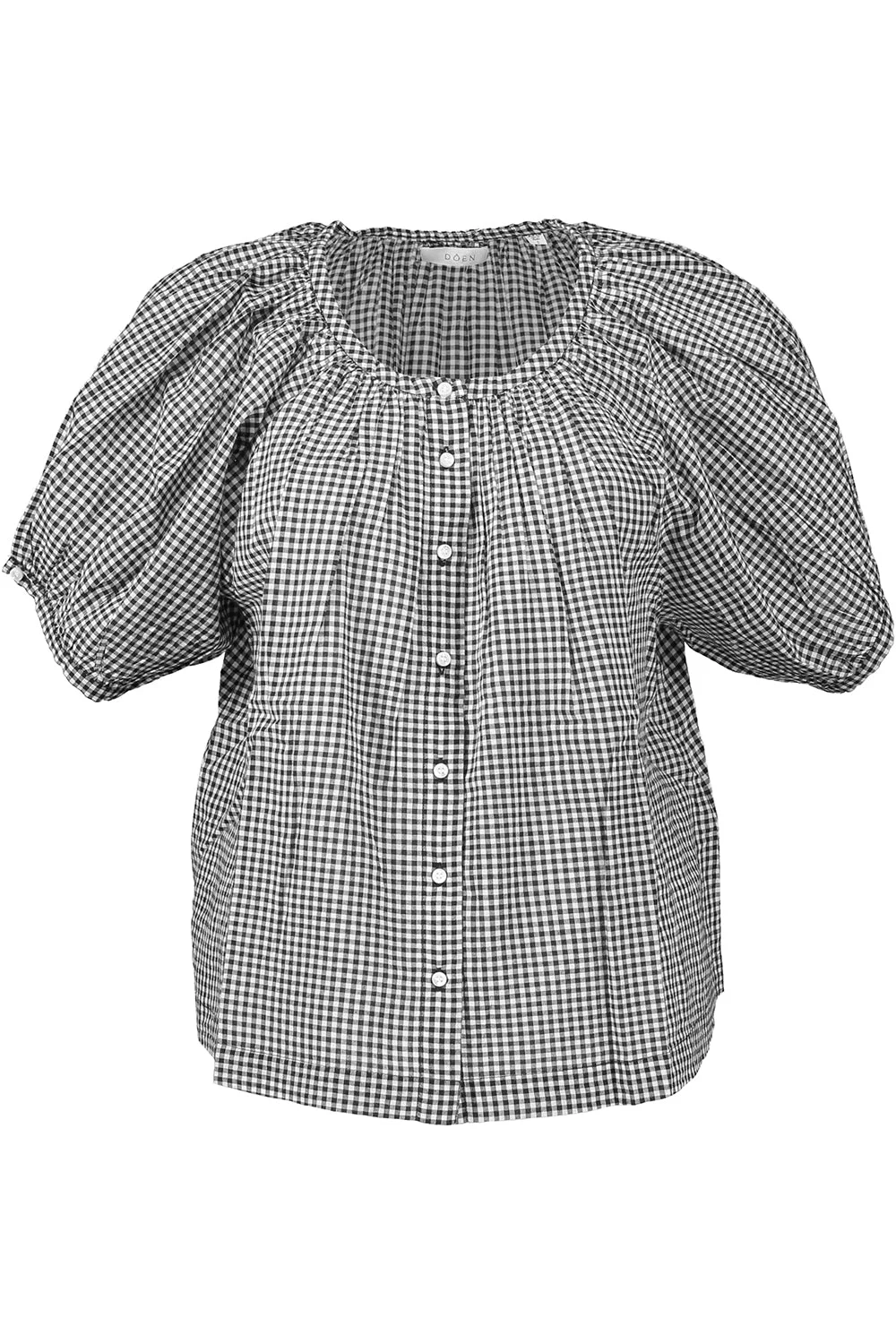DETAILS AND INSIGHT Doen june blouse in navy. 100% Cotton Machine Wsh Cold Made In India Style 399-1868-NVY GINGHAM