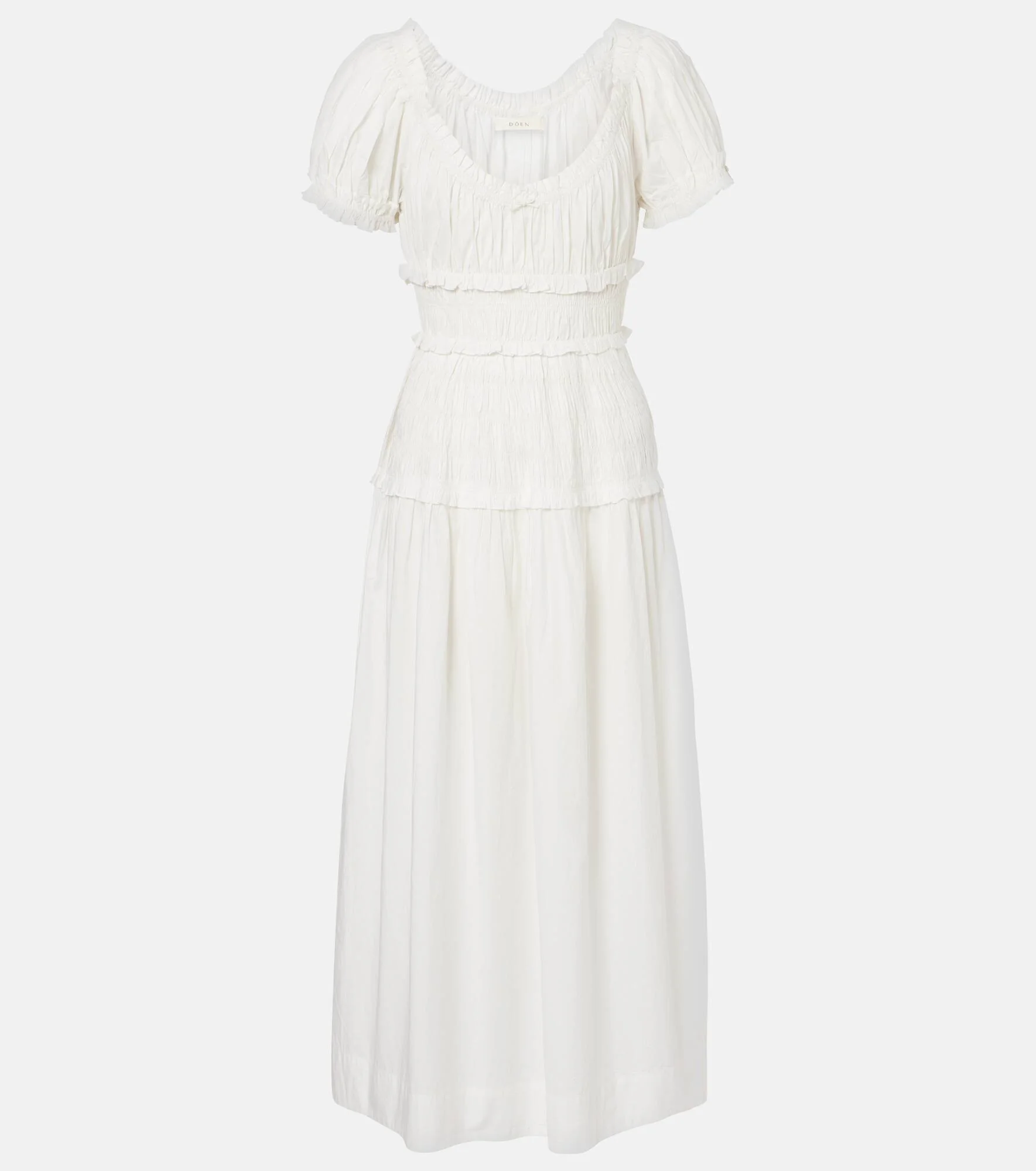 Beloved for its soft, nostalgic aesthetic, Doen celebrates womanhood in all its forms. The Leanne midi dress is made from crisp cotton poplin with a shirred bodice and subtle puff sleeves. Product Details - Material: 100% cotton (organic) - Care instructions: hand wash cold - Made in India - Color: white - Designer color name: Salt - Item number: P01137108 Size & Fit - True to size - Cinched waist - Elasticated waist - Non-stretchy fabric - The model seen in the picture is 178cm-5'10" and wearing a size XS