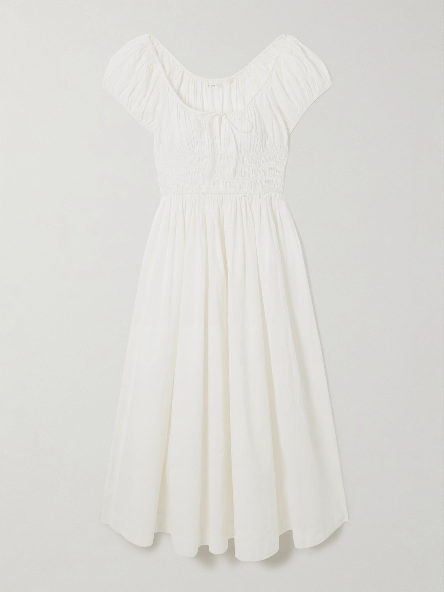 DOEN's romantic designs are inspired by the effortless style of the Californian coast. This prairie-like 'Quinn' dress is cut from crisp organic cotton-poplin that's shirred through the bodice and has pretty puffed sleeves. Size & Fit - Fits true to size, however those who are between sizes should take the smaller size - Designed to be fitted at the bust and waist, loose at the hip - Elasticated at the neckline and waist for a flexible fit - Lightweight, non-stretchy fabric - Model is 177cm/ 5'10" and is wearing a size Small Model measurements: - Bust: 80cm/ 31.5" - Waist: 60cm/ 23.5" - Hip: 89cm/ 35" Details & Care - Off-white organic cotton-poplin - Slips on - 100% organic cotton - Designer color: Salt
