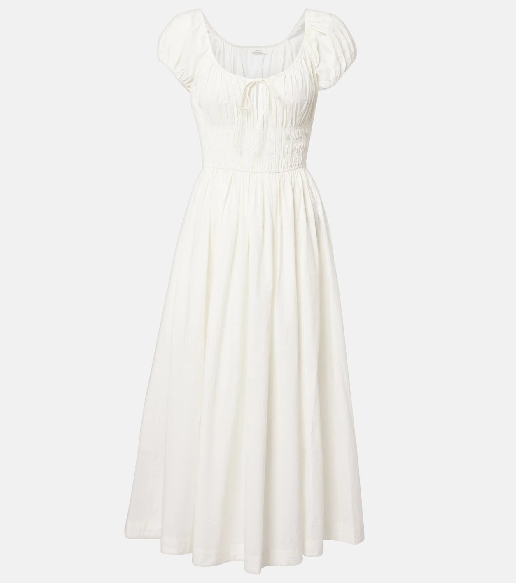 Based in Los Angeles, Doen designs pieces inspired by California’s soft, nostalgic aesthetic. Expertly made from cotton poplin, the Quinn midi dress features a smocked waist and a scoop neckline with elegant self-ties. Product Details - Material: 100% cotton (organic) - Care instructions: hand wash cold - Made in India - Color: white - Designer color name: Salt - Elasticated waistband - Cuff: elasticated - Item number: P01155324 Size & Fit - True to size - Loose fit, elasticated waist - Non-stretchy fabric - The model seen in the picture is 178cm-5'10" and wearing a size XS