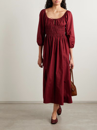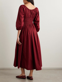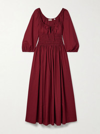 Quintessa tie-detailed shirred organic cotton-poplin midi dress Burgundy