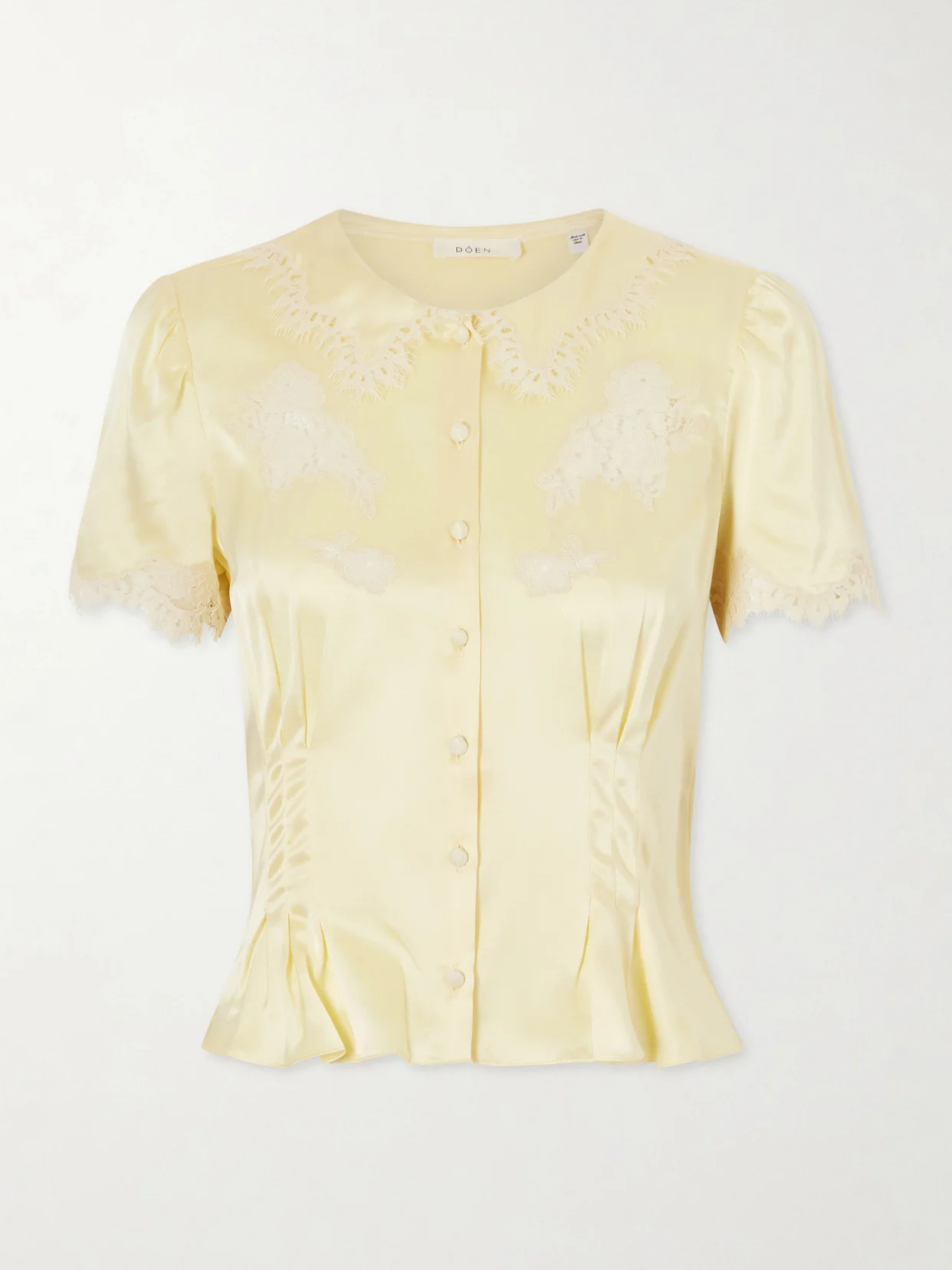 DOEN's ‘Yvette' blouse echoes the soft femininity of the 1940s. Cut from luminous silk-satin, it's shaped with soft darts and traced with delicate lace, while tonal buttons complete the nostalgic silhouette.