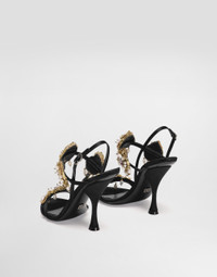 In the Fall/Winter 2025 Fashion Show Collection, shearling jackets, in fur-free versions, reveal slip dresses and create contrast' plays while denim welcomes fabric or Leo print inserts. Sweatshirts are the result of long experimentation with volumes. Evening looks become precious thanks to dresses with special embroideries and luminous touches of sequins and crystals. Sheepskin inserts also unite hats, shoes, and bags, including those with pockets. This satin sandal with embroidery and cardinal heel is the epitome of sophistication and elegance, perfect for formal occasions that require a touch of timeless class. Satin sandals with embroidery: • Black • Heel height 105 mm • Leather outsole with metal DG detail • Open toe leather insole with personalized label • Customization with DG crossed logo • Gold and palladium plating • Item equipped with black Cotton bag and black embossed box • Heel height 105 mm • Made in Italy External Composition: 74% Viscose, 25% Silk, 1% Lambskin Internal Composition: 68% Goatskin, 23% Viscose, 9% Silk