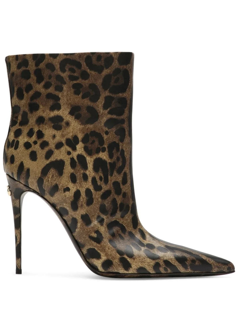 105mm leopard-print leather boots Highlights - Brown - Calf leather - All-over leopard print - Gold-tone logo plaque - Pointed toe - Slip-on style - Branded leather insole - 105mm stiletto heel - Leather sole - Ankle-length Made in Italy Composition Lining: Calf Leather 100% Outer: Calf Leather 100% Sole: Calf Leather 100%