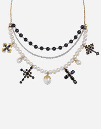 Necklace formed of a main chain in yellow gold from that winds into three different strands. one made with fifteen hand joined black jade beads, a white gold "belcher" chain and a chain consisting of thirty freshwater pearls. This final element has been embellished by four pendants in the shape of a cross, made with round, oval and marquise black sapphires, and three pendants with drop pearls. An additional medallion featuring the Virgin Mary with the "DOLCE&GABBANA" logo on the back has been added to the end of the adjustable chain. Technical specifications. • Gold 18 Kt • Length. 40 + 5 cm adjustable. • Gemstones. 52 round, marquise and oval black sapphires, 15 black jade spheres, 30 spherical freshwater pearls, 3 freshwater drop pearls Yellow and white 18 kt Gold