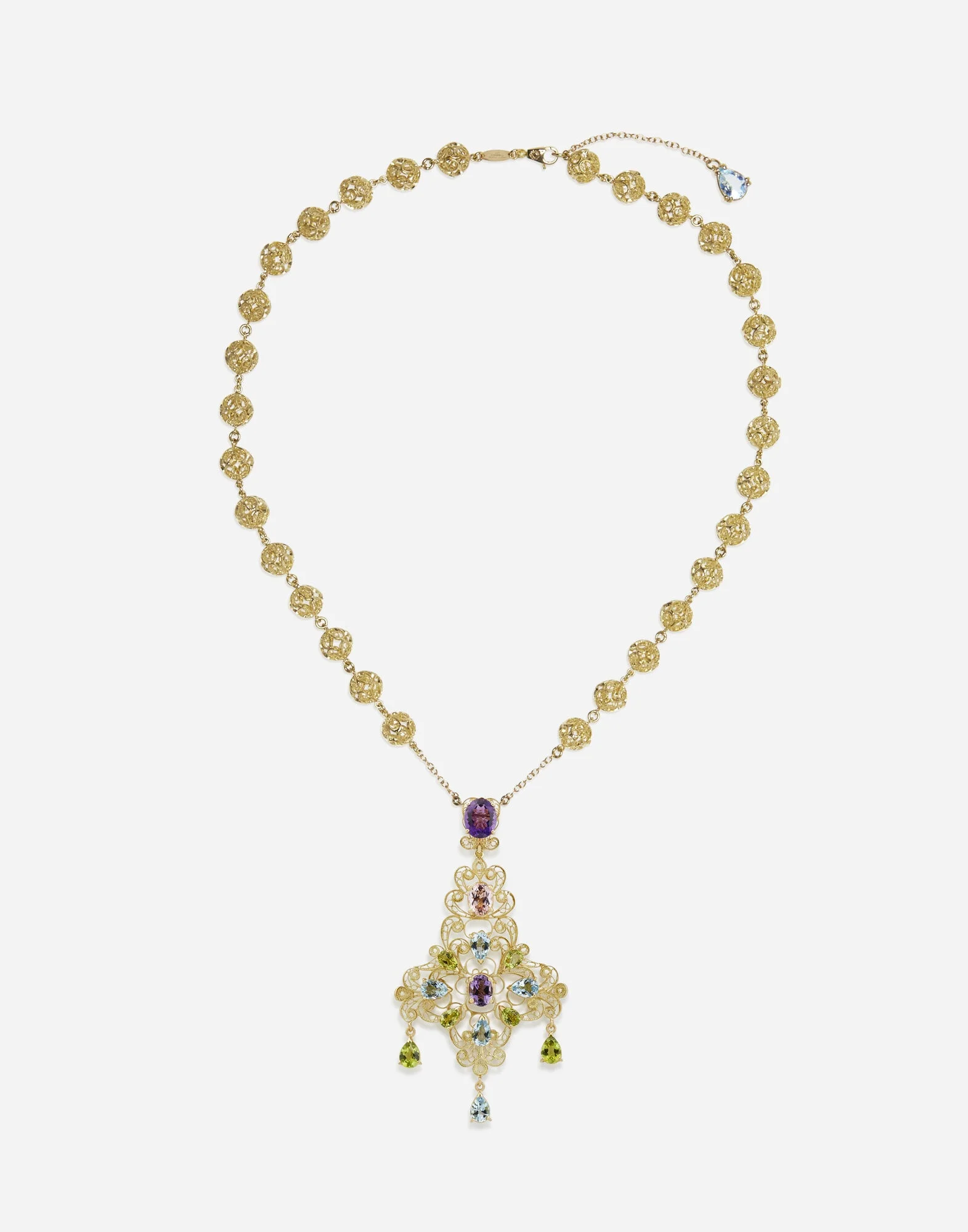 Filigree necklace composed of a chain with spheres linked by hand and a filigree pendant embellished with a rich creation of gems with different shapes. Another filigree motif with a refined oval amethyst joins the necklace, and a pendant and three drop gems have been added to the lower part, further enriching the creation. A drop aquamarine has been added as the end of the adjustable chain, while an oval plate bearing the "DOLCE&GABBANA" logo has been placed by the fastening. Technical specifications. • Gold 18 Kt. • Length. 45 + 5 cm adjustable. • Gemstones. 1 oval morganite, 6 drop-shaped aquamarines, 6 drop-shaped peridots, 2 oval amethysts, quartz variety. • Made in Italy Yellow 18 kt Gold