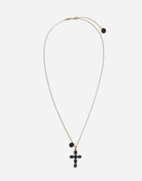 Necklace composed of a thin "belcher" chain and two pendants. a Latin cross made of oval shaped black sapphires and a black jade carved rose. Another black jade rose has been added to the end of the adjustable chain. An oval tag bearing the "DOLCE&GABBANA" logo is located between the chain and the fastening. Technical specifications. • Gold 18 Kt. • Length. 50 + 2.5 + 2.5 cm adjustable. • Gemstones. 6 oval black sapphires, 2 black jade roses. • Made in Italy Yellow 18 kt Gold