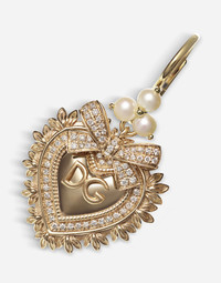 Earrings in 18 kt yellow gold composed of three elements that flow elegantly from top to bottom in the following order. a clover made up of spherical pearls, an elegant bow and the magnificent Sacred Heart, symbol of unconditional love and faith, both enriched with diamonds. The DG logo is engraved inside the heart. Technical specifications. • Gold 18 Kt. • Gemstones. pcs 156 colourless diamonds ( 0,35 ct* ) and 6 pcs fresh water pearls. • Made in Italy *The weight of the stones is an average value provided for reference purposes only. Yellow 18 kt Gold