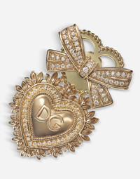 Earrings in 18 kt yellow gold featuring an elegant bow and the magnificent Sacred Heart, symbol of unconditional love and faith, both enriched with diamonds. The DG logo is engraved inside the heart. Technical specifications. • Gold 18 Kt. • Gemstones. pcs 176 colourless diamonds ( 0,45 ct* ). • Made in Italy *The weight of the stones is an average value provided for reference purposes only. Yellow 18 kt Gold