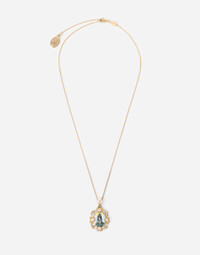 Necklace featuring a thin belcher chain and a nineteenth-century hand-painted ceramic miniature of the Madonna, attached to the main chain by a clover of round pearls. The precious pendant is encased in a gold frame embellished with four round pearls on floral settings. A small medallion depicting the Madonna, with the DOLCE&GABBANA logo on the back, has been added to the final link on the adjustment chain. •Technical specifications. •Gold 18 Kt. •Length. 45 + 5 cm adjustable. •Gemstones. 7 freshwater spherical pearls. •Made in Italy. Yellow 18 kt gold