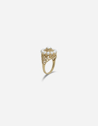 This ring features a central rosette motif embellished by pearls. The baroque curlicues, which are inspired by the Bourbon era and seem to connect the central gemstone with those along the circumference, accentuate the luminosity of the whole. The chromatic contrast between the yellow of the gold and the white of the pearls accentuates both the refined elegance of the metalwork and the preciousness of the materials. Technical specifications. • Gold 18 Kt. • Gemstones. 13 freshwater pearls. • Made in Italy Yellow and White 18 kt Gold