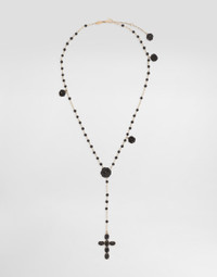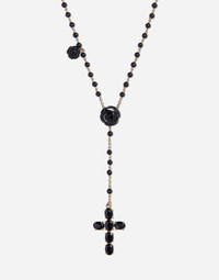 Rosary made up of forty-four black jade spheres linked by hand and four carved black jade roses. A cross pendant with the "DOLCE&GABBANA" logo on the back is connected to the main wire by five black jade spheres. Another rose has been added to the end of the adjustable chain. Technical specifications. • Gold 18 Kt • Length. 40 + 2,5 + 2,5 cm adjustable • Gemstones. 6 oval black sapphires, 49 black jade spheres, 5 black jade roses Yellow 18 kt Gold