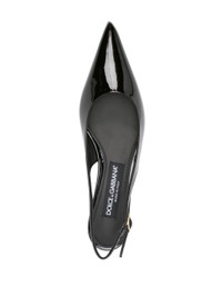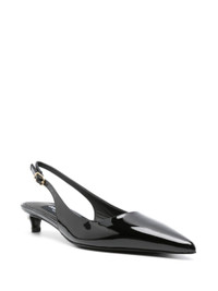 40mm patent slingback pumps from DOLCE & GABBANA featuring black, calf leather, patent finish, gold-tone logo plaque, buckle-fastening slingback strap, pointed toe, branded leather insole and kitten heel. Size & Fit Model Measurements: Bust: 0cm Height: 0cm Hips: 0cm Waist: 0cm HEEL: 4cm