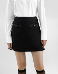 The Women's Black Sicily Collection reinforces Dolce&Gabbana's iconic fabrics and codes rooted in Italian heritage. Sensual silhouettes, highlighted by floral prints and refined corsetry, evoke an intriguing elegance, while the iconic black lace, satin, and velvet dominate the collection. Denim in various shades of blue introduces a contemporary twist, balancing the classic and modern. Embroidered crosses, medals, and jewelry add a sophisticated touch. A-line wool crepe miniskirt: • Black • Low rise • Patch pockets with duchess trims • DG logo buttons on pockets • Stretch silk satin lining • Rear zipper and hook-and-bar fastening • The piece measures 45 cm from the waist down on a size IT 40 • The model is 175 cm tall and wears a size IT 40 • Made in Italy External composition: 90% Wool 08% Silk 02% Polyester Internal composition: 92% Silk 08% Spandex