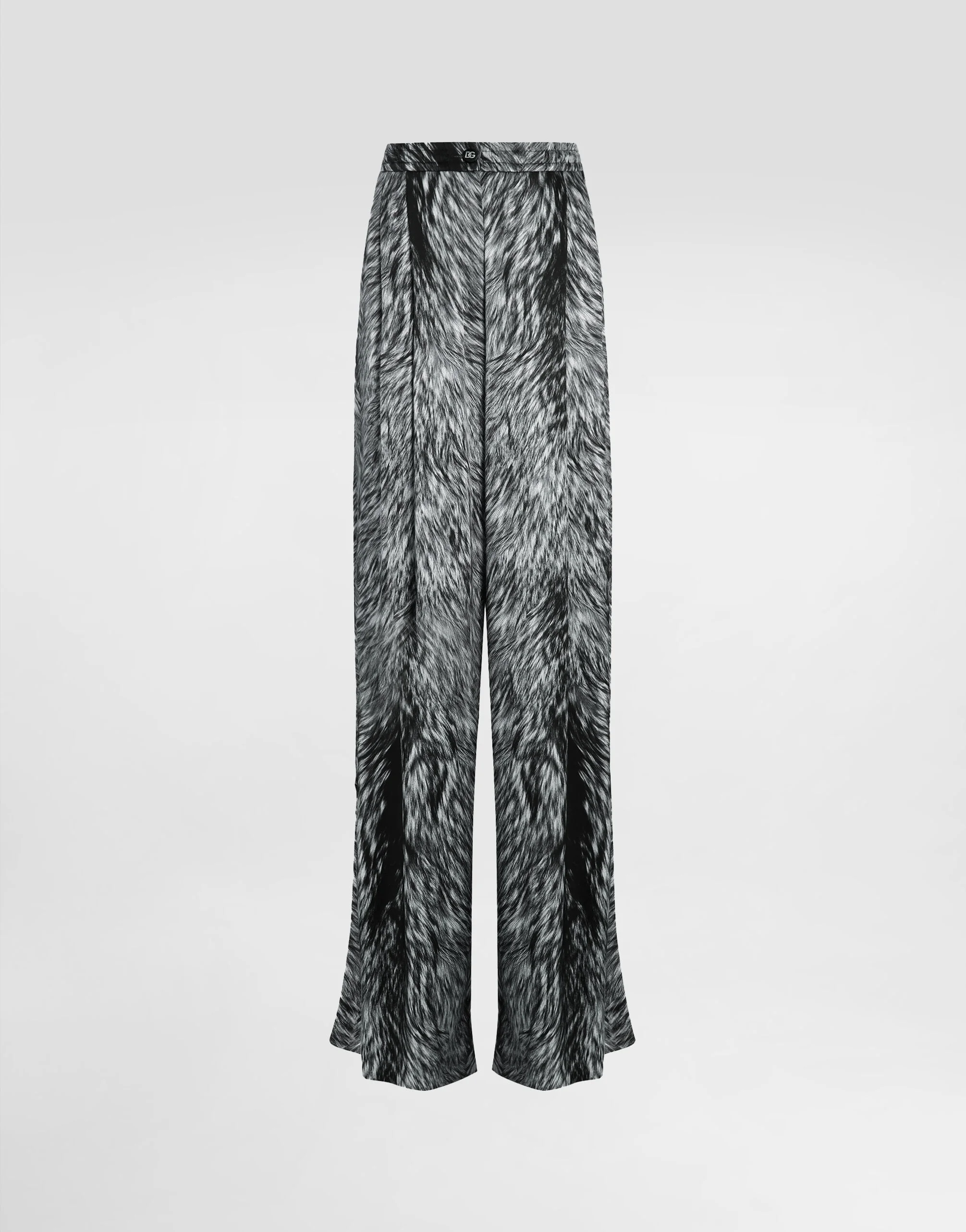 The Everyday Women's Collection reimagines contemporary daily wear with Dolce&Gabbana's signature style codes. Iconic fabrics mix with standout details like embroidered flowers, crystals, and jewel buttons, infusing elegance into every look. Gray animal print accented with green and purple, hyper-geometric jewelry, voluminous shapes and transparencies add unique touches. Men's tweed is reinvented with graphic twists, creating distinctive pieces that reflect refined sensuality. Silk satin pajama pants with fur print and piping: • Animal print • High stretch waist • Double darts • Front slant pockets • Welt back pockets • Inner leg: 83 cm • Hem: 34 cm • Zipper and button fastening with DG logo • The model is 175 cm tall and wears a size IT 40 • Made in Italy The difference in the print placement that you may find on this product is a feature of Dolce&Gabbana’s “Handmade” pieces. A detail that makes every garment or accessory unique and exclusive. External composition: 92% Silk 8% Spandex