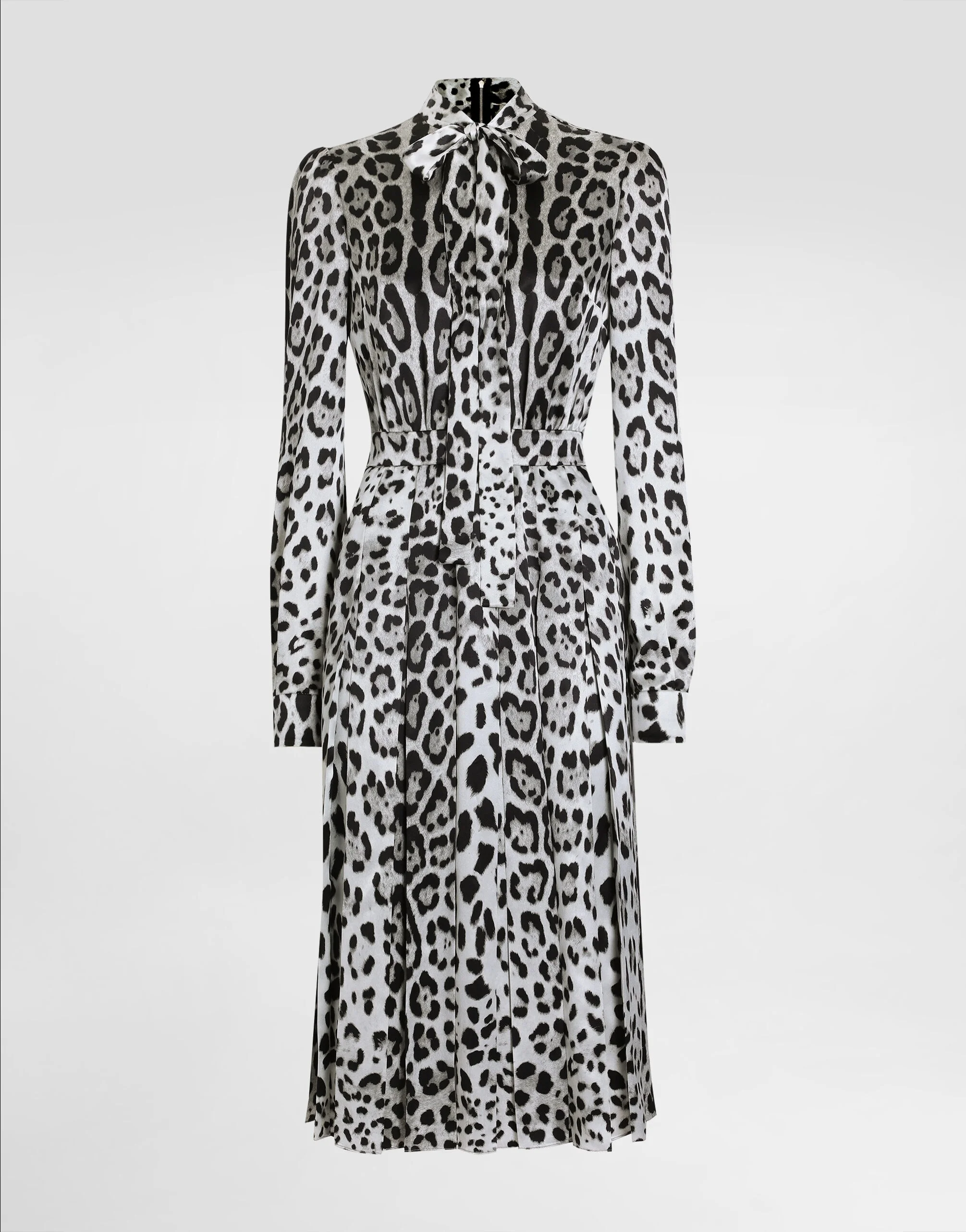The Everyday Women's Collection reimagines contemporary daily wear with Dolce&Gabbana's signature style codes. Iconic fabrics mix with standout details like embroidered flowers, crystals, and jewel buttons, infusing elegance into every look. Gray animal print accented with green and purple, hyper-geometric jewelry, voluminous shapes and transparencies add unique touches. Men's tweed is reinvented with graphic twists, creating distinctive pieces that reflect refined sensuality. Silk satin calf-length shirt dress with pussy-bow and leopard print: • Animal print • Crew-neck with pussy-bow • Long sleeves • Unlined • Rear zipper and hook-and-bar fastening • The piece measures 116 cm from the center back on a size IT 40 • The model is 175 cm tall and wears a size IT 40 • Made in Italy The difference in the print placement that you may find on this product is a feature of Dolce&Gabbana’s “Handmade” pieces. A detail that makes every garment or accessory unique and exclusive. External composition: 100% Silk
