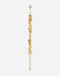 Bracelet composed of a chain with twisted wire rings and 13 citrines with different cuts and settings connected in such a way as to create a carefully crafted curve. The DG crossed logo has been added as the end of the adjustable chain, while an oval plate bearing the “DOLCE&GABBANA” logo has been placed by the fastening. Technical specifications: Gold yellow18 Kt. Length: 14 + 6 cm adjustable. Gemstones: 4 citrines (quartz variety): round shape; 6 citrines (quartz variety): oval shape; 1 citrines (quartz variety): square shape; 1 chabochon citrine (quartz variety); 1 citrine (quartz variety): rectangular shape. Made in Italy 18kt yellow golg