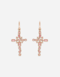 18kt red gold leverback earrings featuring a cross with tourmalines of different cuts and settings. Technical specifications: Red Gold 18 Kt. Gemstones: 10 round tourmalines; 4 oval tourmalines; 6 square tourmalines; 4 pear tourmalines; 2 oval tourmalines; 4 rectangular tourmalines. Made in Italy 18kt red gold