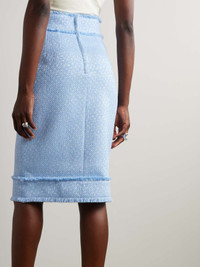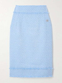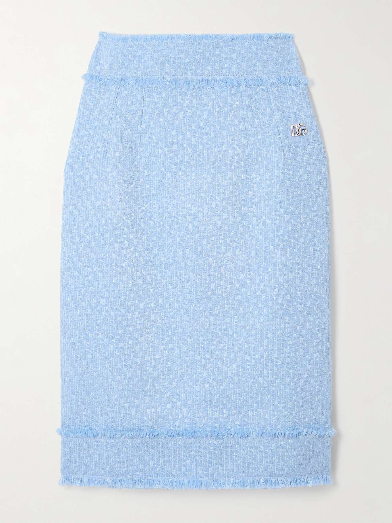 EDITORS'NOTES Dolce&Gabbana's skirt recalls sophisticated vintage styles. Made from wool-blend tweed, it has a pencil shape outlined in tactile fraying and features the silver-tone 'DG' logo. Wear yours as a set with the matching jacket in our edit. SIZE & FIT Model measurements: - Fits true to size, take your normal size - Falls below the knee, designed to be worn at the waist - Mid-weight, non-stretchy fabric - Model is 177cm/ 5'10" and is wearing an IT 38 - Bust: 79cm/ 31" - Waist: 61cm/ 24" - Hip: 89cm/ 35" DETAILS & CARE - Light-blue wool-blend tweed - Concealed hook and zip fastening at back - 67% wool, 27% viscose, 6% polyamide; lining: 92% silk, 8% elastane - Dry clean